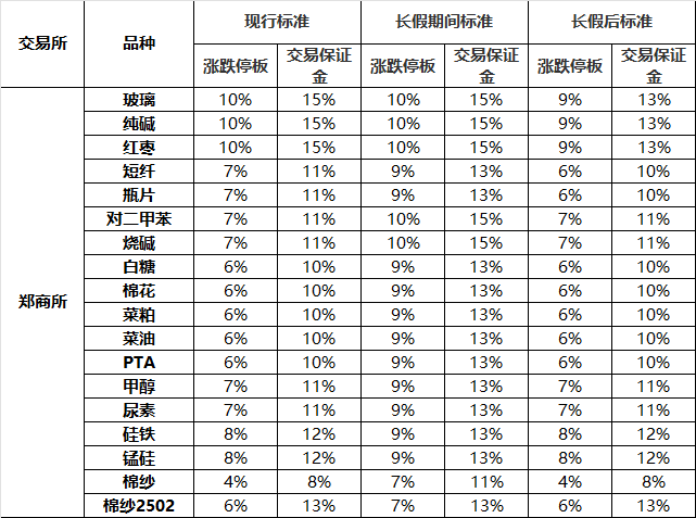 鄭州商品交易所:2025年2月5日(星期三)恢復交易后,自品種持倉量最大的合約未出現(xiàn)漲跌停板單邊市的第一個交易日結(jié)算時起,短纖、瓶片期貨合約的交易保證金標準為10%,漲跌停板幅度為6%;玻璃、純堿、紅棗期貨合約的交易保證金標準為13%,漲跌停板幅度為9%,其他品種期貨合約的交易保證金標準和漲跌停板幅度恢復至調(diào)整前水平。