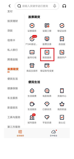 選擇左邊“股票期貨”,勾選下設(shè)子菜單“期貨服務(wù)”,進(jìn)入期貨業(yè)務(wù)辦理界面