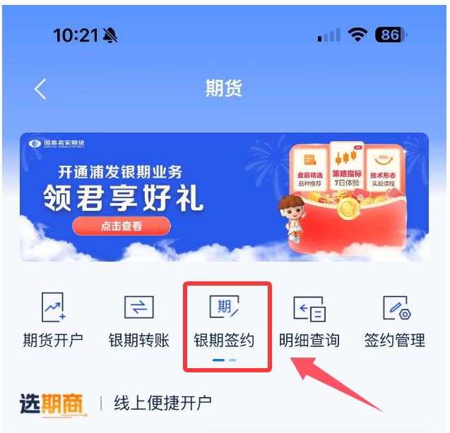第一步:打開浦發(fā)銀行手機APP,登錄手機銀行,在上方搜索框輸入“期貨”,選中“期貨”-“銀期簽約”。