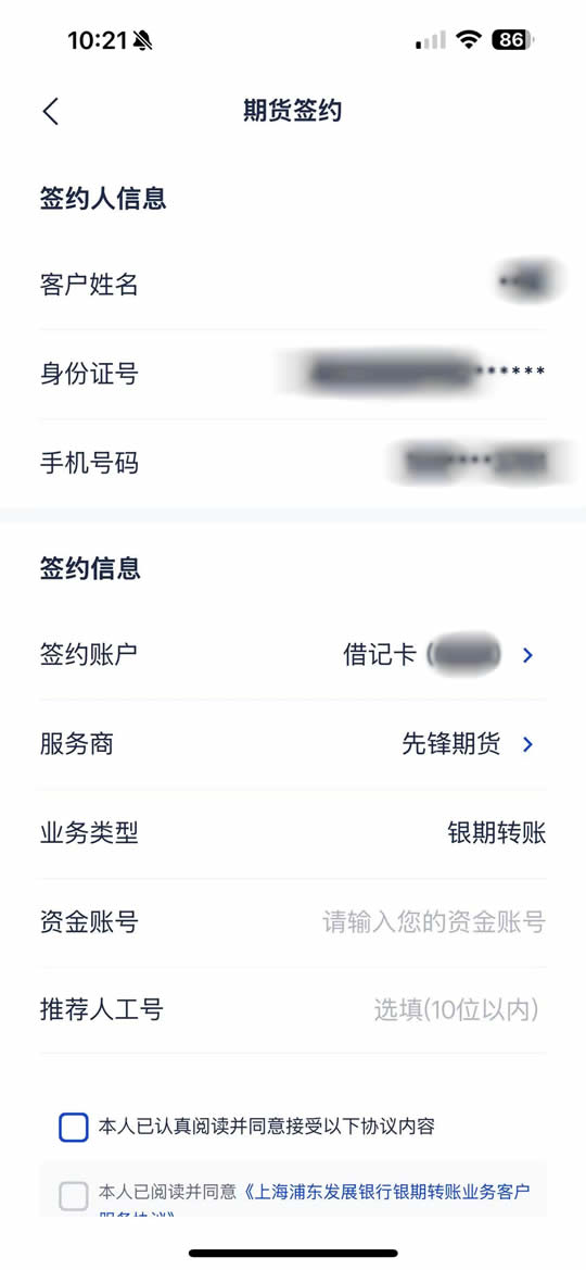 第二步:在“銀期簽約”欄目下點擊“新增銀期簽約”,在“服務商”處找到“先鋒期貨”,填寫并確認基本信息,在“資金賬號”處輸入您的“期貨資金賬號”,
