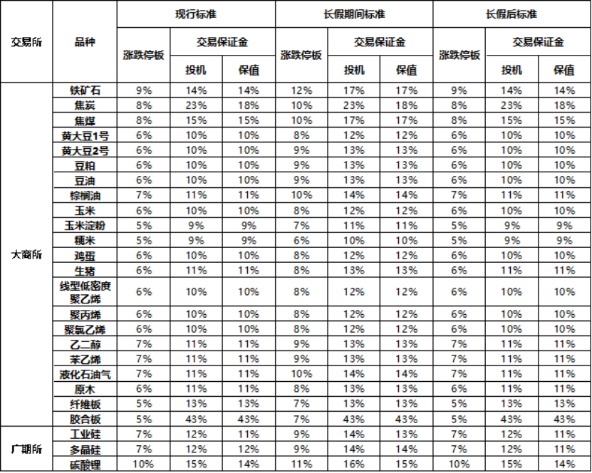 廣州期貨交易所:2025年2月5日(星期三)恢復交易后,在各品種期貨持倉量最大的合約未出現(xiàn)漲跌停板單邊無連續(xù)報價的第一個交易日結(jié)算時起,多晶硅期貨合約套期保值交易保證金標準調(diào)整為11%,漲跌停板幅度和投機交易保證金標準恢復至調(diào)整前水平;工業(yè)硅、碳酸鋰期貨合約漲跌停板幅度、投機交易保證金標準和套期保值交易保證金標準恢復至調(diào)整前水平。