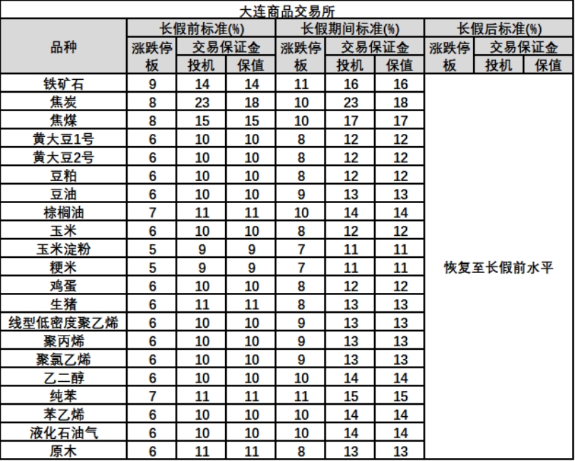 其他品種期貨合約的交易保證金標準和漲跌停板幅度恢復至調(diào)整前水平。
